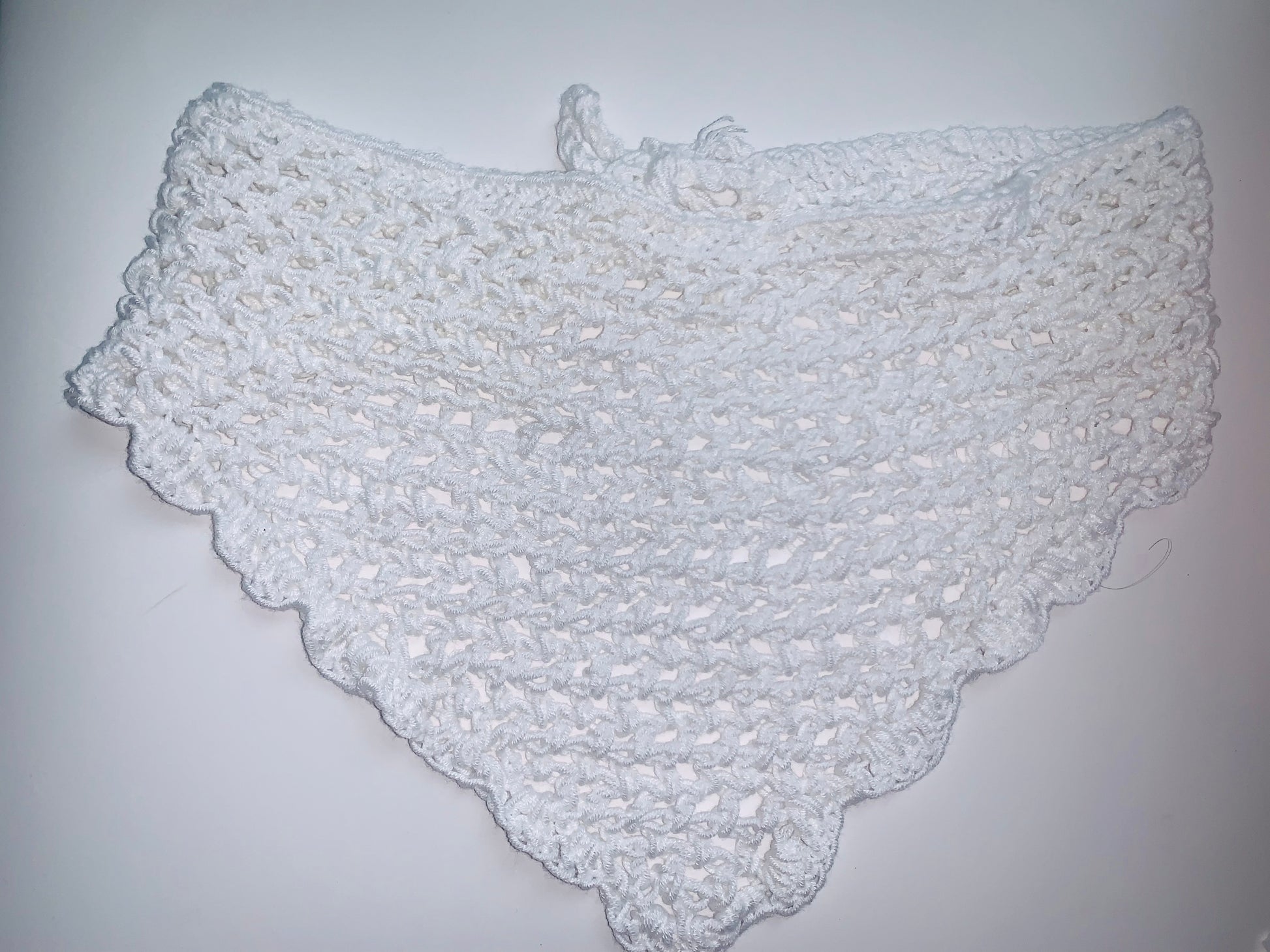 Crochet mesh triangle bandana made with cotton yarn, size/weight 1 and 2. Pictures are a sample, final product will be made with size 2 cotton yarn. Currently comes in a few colors, more will be added when available. This specific design is a mesh triangle pattern with scalloped edges. It ties underneath the hiding the strings. Perfect for day-to-day use and adds something cute to simple hairstyles or just hair that is down. This product will mostly be made upon order so please allow about 1-2 weeks to ship.
