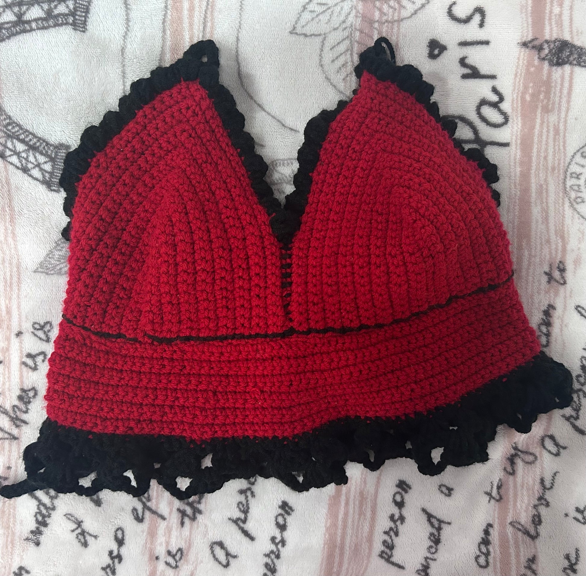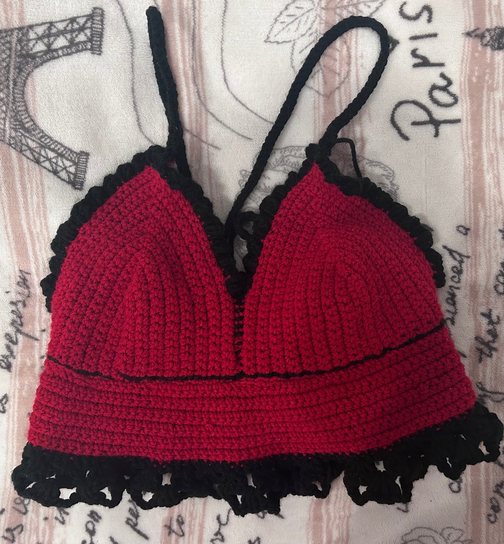 Crochet halter top with a tie up back. Top is made with cotton yarn and comes in different sizes. The product picture was made with acrylic so it may look different.